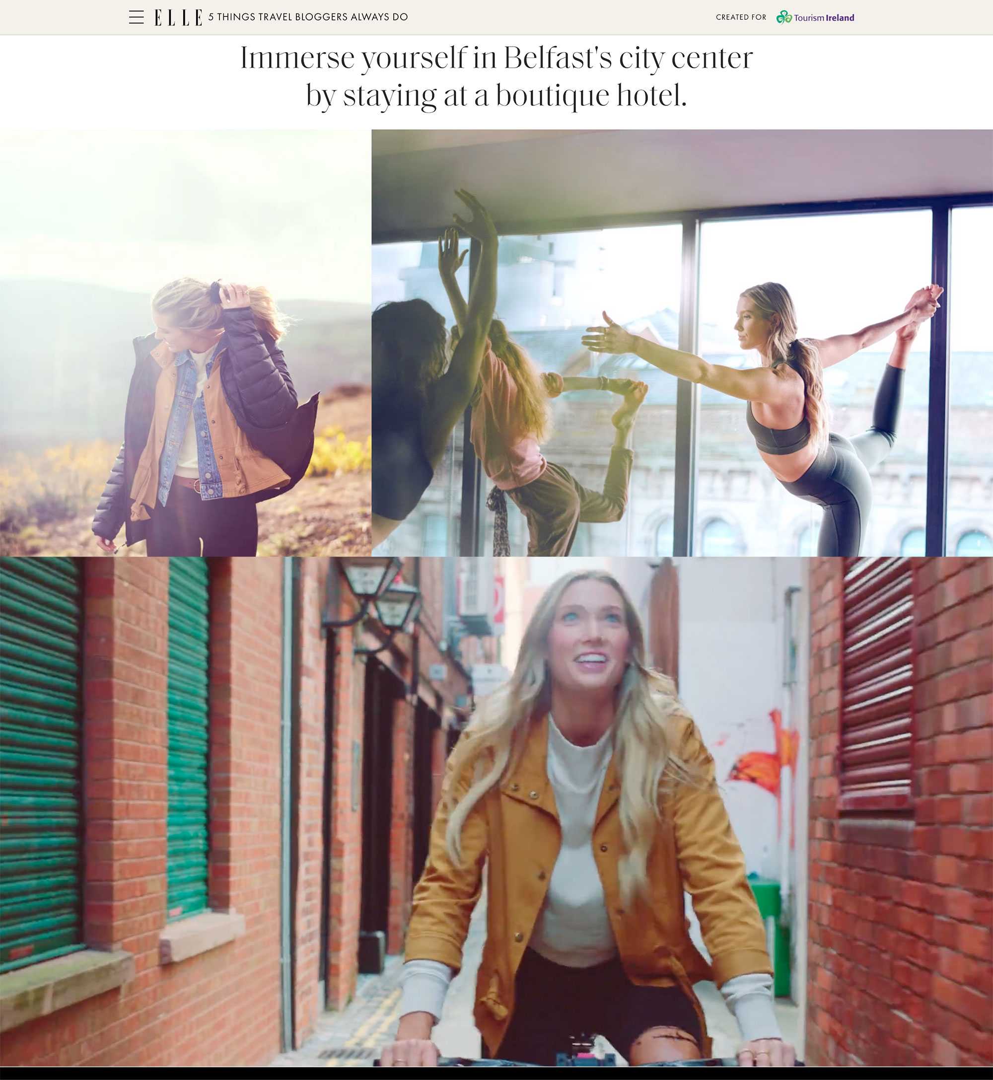 The content we produced included one documentary-style video on Esquire that detailed how to experience Ireland through all five senses, which was then broken down into five social assets, as well as another video on Town & Country capturing five of the most beautiful and historic must-see landmarks. We also shot an influencer-led travel guide to Belfast for ELLE; created a list of the best scenic drives and trail runs on Road & Track and Runner’s World, respectively; and packing guides on Town & Country and ELLE.